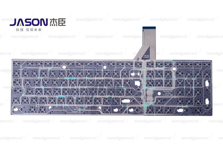 三層設計,上、中、下三層導電膜,上、下層分別印有電路連線及按鍵觸點,中間隔層上有上、下觸點層對應的圓孔,隔層的作用是防止上下層電路短路。